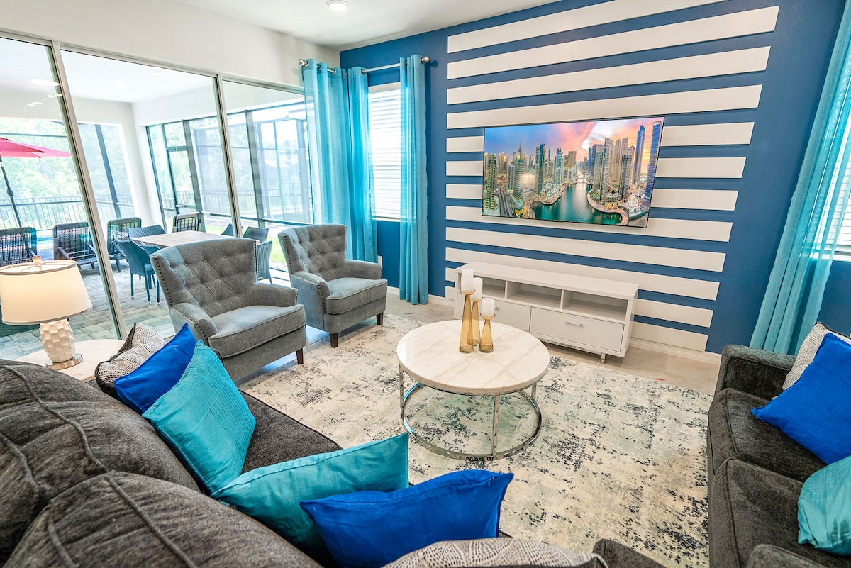 This joyful & luxury vacation house (built in June 2022) with lake-view is located in the newest section of the renowned Storey Lake Resort, close to the Disney World & all major theme parks in Orlando. It features an immersive Avatar game room (air hockey, foosball, pool table, etc), 3 entertaining areas, 9 bedrooms w/ high-end deco, 5 bath, 12 SMART TVs, Netflix, fast WiFi, private pool/spa/patio facing a beautiful lake, EV outlet, & full access to the amazing amenities @Storey Lake clubhouse.