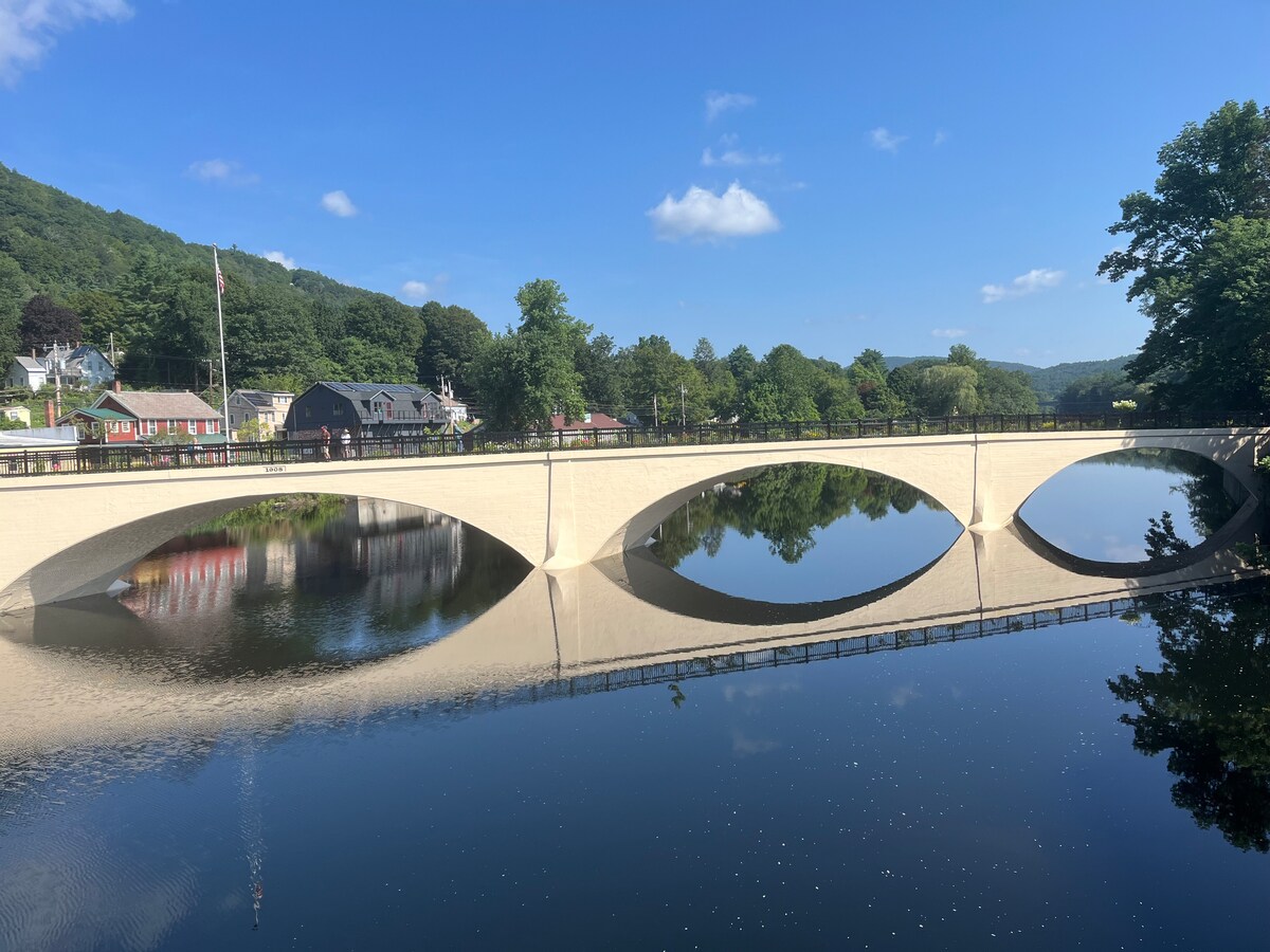 Come explore our unique area and stay in a renovated, light filled studio with private entrance, secluded deck , kitchenette and bath located in the quaint New England village of Shelburne Falls.We are within easy walking distance to numerous shops, candlepin bowling, Glacial potholes, tennis/basketball courts, Bridge of Flowers, eateries/restaurants, Pothole pictures, groceries, playgrounds, hiking & swimming areas, a natural food store and art galleries.Close to Berkshire East and Zoar!