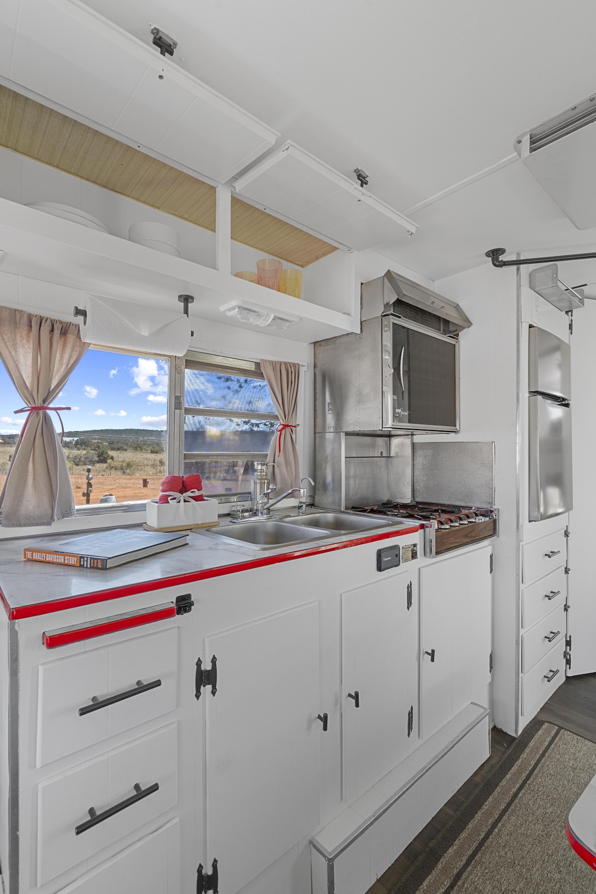Sleeping Beauty – A Real Time Capsule. Stay in Sleeping Beauty, a beautifully preserved vintage motorhome at Starlite Vintage Resort. This cozy camper features an RV full-size bed for two and a couch that converts into bunks for adventurous kiddos, plus a private bathroom with shower, A/C, heat, and a kitchenette. Outside enjoy your BBQ grill, picnic table, lounge chairs, and fire pit. Guests also enjoy the seasonal pool, playground, yard games, and our iconic vintage gas station photo spot.