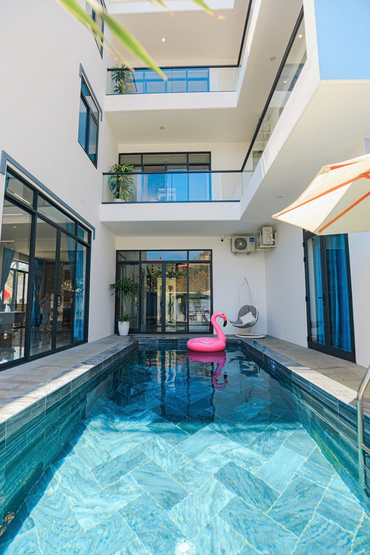* Location: Located in the heart of Vung Tau coastal city, 50 meters walk to the front beach coastline. Next to the cable car station, near Ganh Hao eateries, coffee shops with sea views along Tran Phu street. + Capacity: 15 - 30 guests. + Campus area: 350m2. + Pool area: 3m x 7m. + Scale: 9 bedrooms, 11 beds, 11 WCs. + New, modern furniture, with elevator. + Fully equipped kitchen with cooking utensils. ** ESPECIALLY, there is a large, spacious, and airy terrace to meet the needs of organizing BBQ parties with sea views.