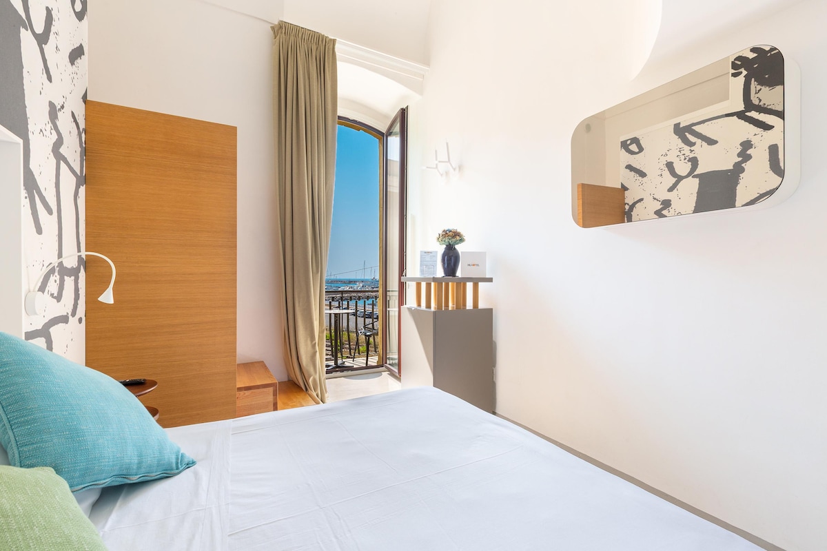 Elegant and bright, the Sea View Room of Scaglione Palace offers a unique experience in the heart of the historic center of Gallipoli. From the window, a breathtaking view of the sea will give you unforgettable awakenings. The room has a comfortable private terrace, ideal for relaxing while admiring the view. Equipped with air conditioning, Wi-Fi, TV, minibar and heat pump, it guarantees comfort and charm in a refined atmosphere.