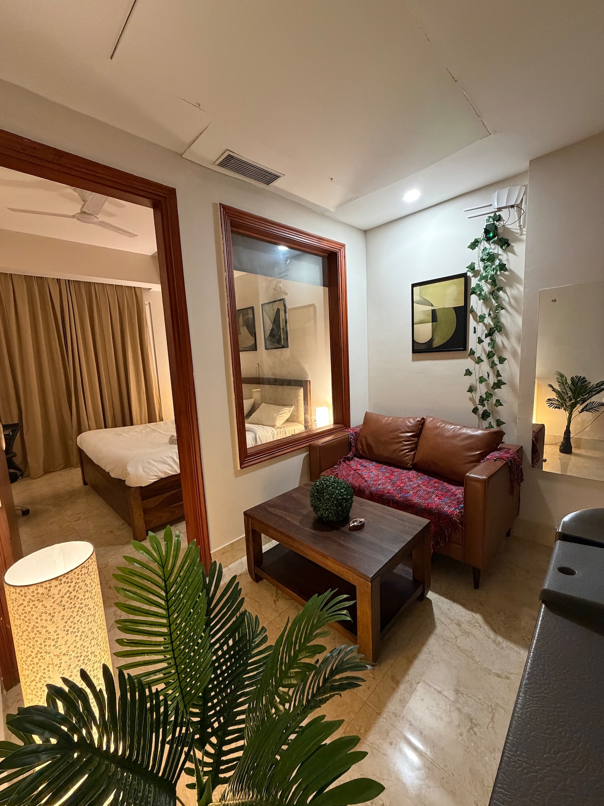 A thoughtfully designed heritage-style 1BHK in Sector 38, Gurgaon, just 5 minutes from Medanta Hospital. Featuring a vibrant private patio, handcrafted décor, cozy interiors, and a fully equipped kitchen that isideal for couples and tourists seeking a peaceful stay with old-world charm.