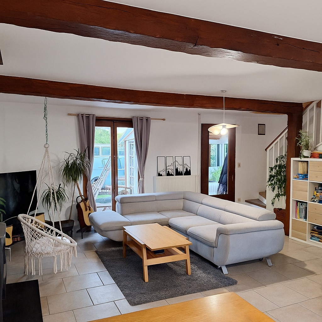 En campagne avec son coin de verdure. Un hall d'entrée avec machine à laver, un étendoir et WC. Ensuite, une cuisine bien équipée (crêpière, appareil à raclette, four, plancha) avec une cuisinière, vue sur la terrasse. (barbecue, mobilier.) À l'étage, le salon, une salle de douche, WC, 2 chambres communicantes : la seconde, avec un coin bureau, se situe dans le prolongement de la première. Cette disposition conviviale est particulièrement adaptée aux familles avec enfants ou aux amis.