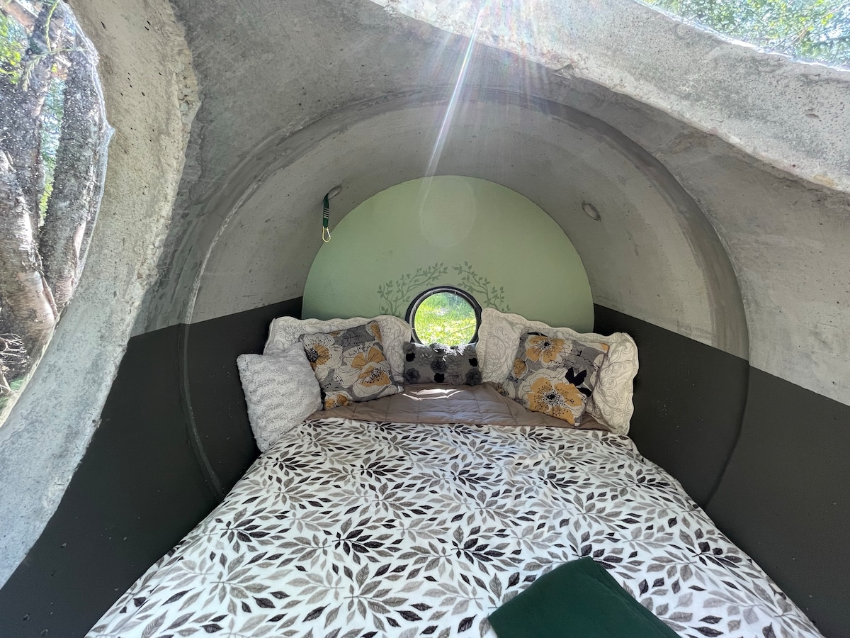 NEW HOBBIT HOUSE @ GLACIER PARK: Come experience the most unique stay on the west side of Glacier National Park in our one and only Stargazer Tube Tent. This "tent" is a concrete cylinder transformed into a glamping cabin -outfitted with plush memory foam RV queen mattress, high quality linens, and a fluffy comforter to insure you have a peaceful nights sleep in the Montana wilderness. It has two round windows and a portal window for all around views of the forest, sky, and mountains.