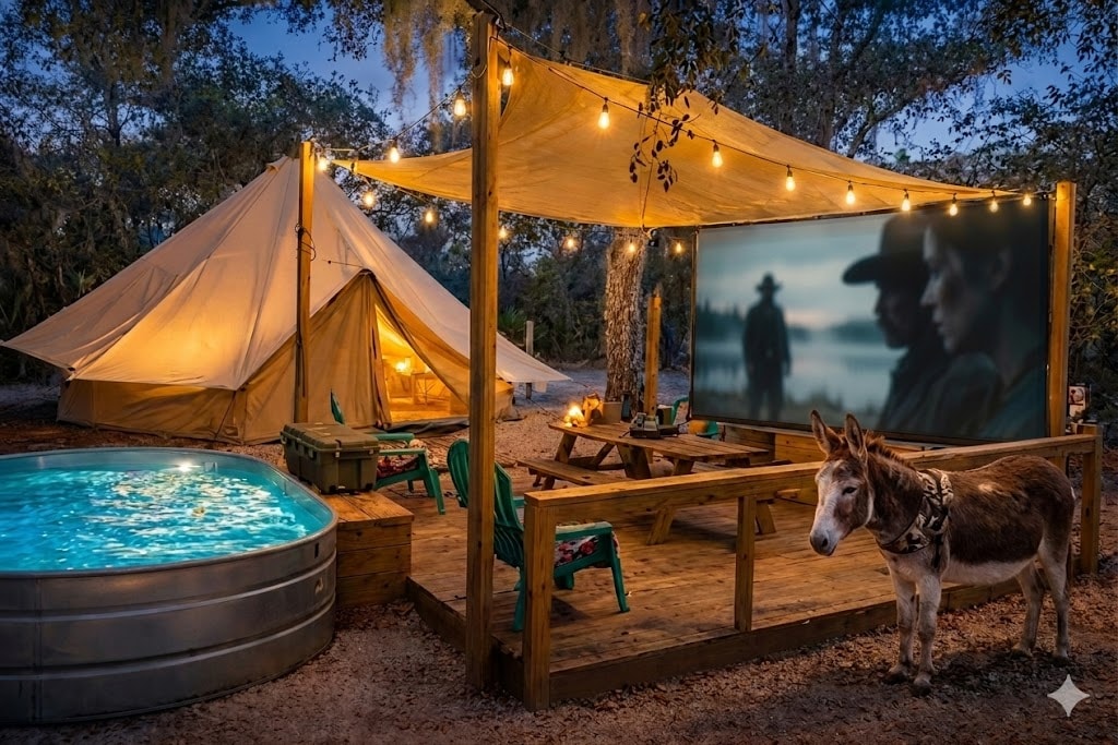 Escape to Animal Lovers Farm, a 20-acre Old Florida retreat beneath a canopy of majestic live oak trees. Stay in our Rustic Bunkhouse and experience life on a real animal farm where friendly donkeys, miniature horses, goats and chickens roam freely. Guests enjoy complimentary guided horseback riding and the peaceful charm of relaxing under the oaks surrounded by nature and animals.