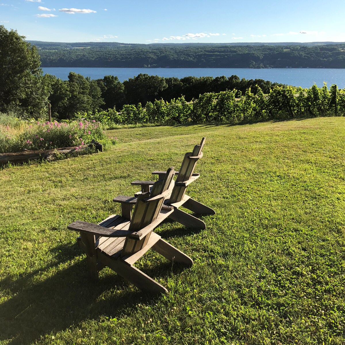 Updated studio in the heart of Finger Lakes Wine Country, with one-of-a-kind views of Seneca Lake and vineyards from a gorgeous lawn. Modern farmhouse inspired decor, luxury linens, an adorable kitchenette, this is the perfect stay for visitors looking to explore the Finger lakes. Take advantage of our fire pit, hike through the vineyards down to our beautiful creek, or drive down the hill for direct lake access in Smith Park. Room is very spacious for 2 but works for 4 with a pull out sofa.