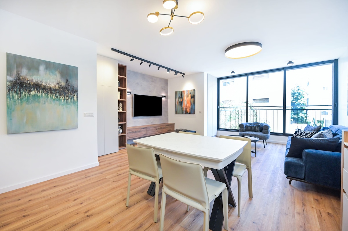Enjoy a stylish experience at this centrally-located place. Brand new and well designed apartment in Bugrashov st. number 62. 2 Bedrooms and very spacious living room. 65 inch TV and designed dinner table. Brand new fully equipped kitchen and bran new shower & bathroom. Perfect stay for young families or small groups!