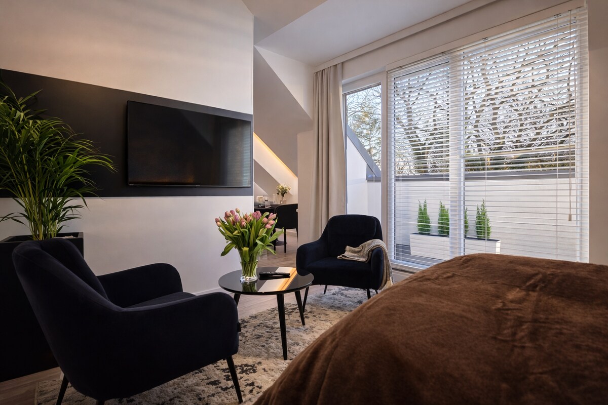 Skwer Malarzy Apartment is a comfortable Deluxe apartment with sunny rooms, an equipped kitchen and a comfortable King Size bed with a total area of 50 m2. Located on the first floor of a tenement house, in the very center of the historic district of Gorzów Wielkopolski, Nowe Miasto, on the banks of the Kłodawka River, just 100m from the Rose Park.