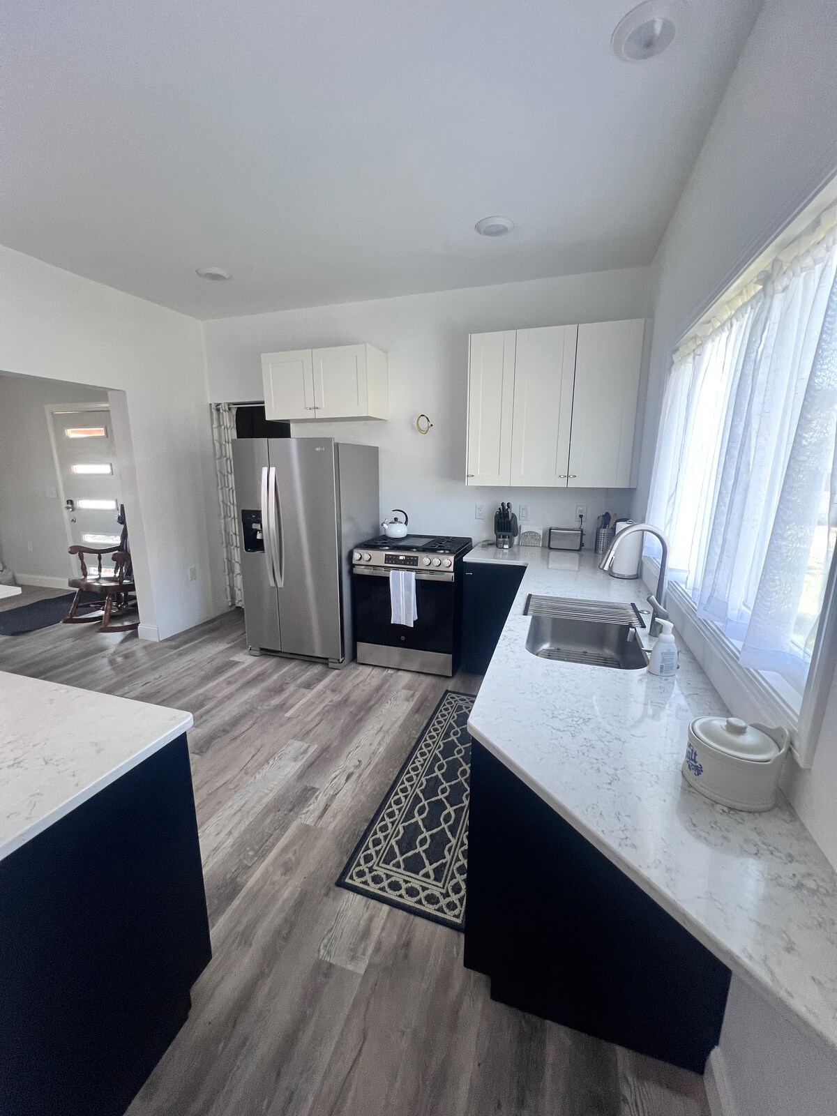 Newly remodeled! This Modern Farmhouse style home is a perfect place for a family or friends to stay. It offers 2 bedrooms, 1 bathroom with a tub/shower, a fully furnished kitchen, dining room and a large fenced in backyard. The bedrooms offer sleeping for 4 with 1 queen bed and 2 twin beds. The kitchen is fully stocked with cooking supplies and a Keurig coffee machine with several options for you to choose from. Full use of the home, fenced in back yard and a washer/dryer for your convenience.