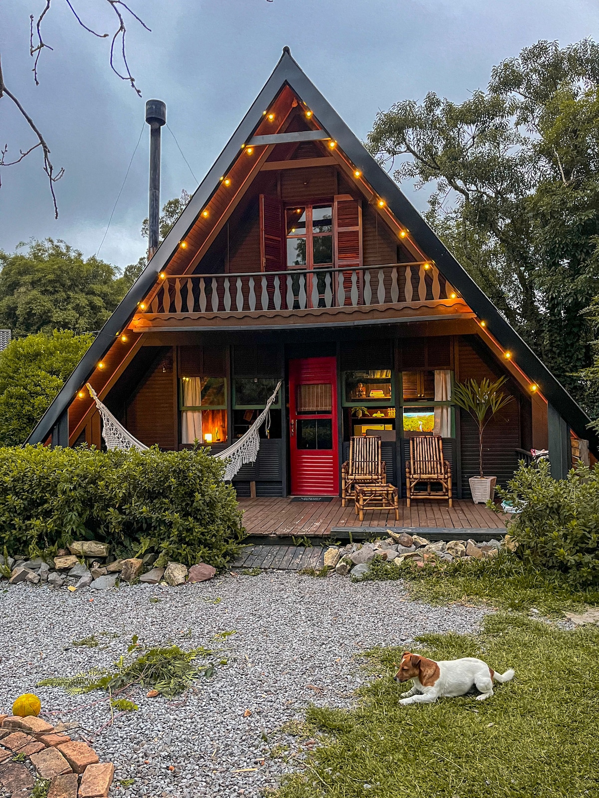 Come and enjoy a unique and unforgettable experience in Gramado. A-frame cabin, surrounded by nature. A refuge with its own style. Native trees, pine trees and araucarias create several layers of green in different shades. Inside, you'll find a combination of rustic and cozy, different textures in every detail, from leather to wood, from iron to glass, which makes the design go beyond the visual and convey sensations.