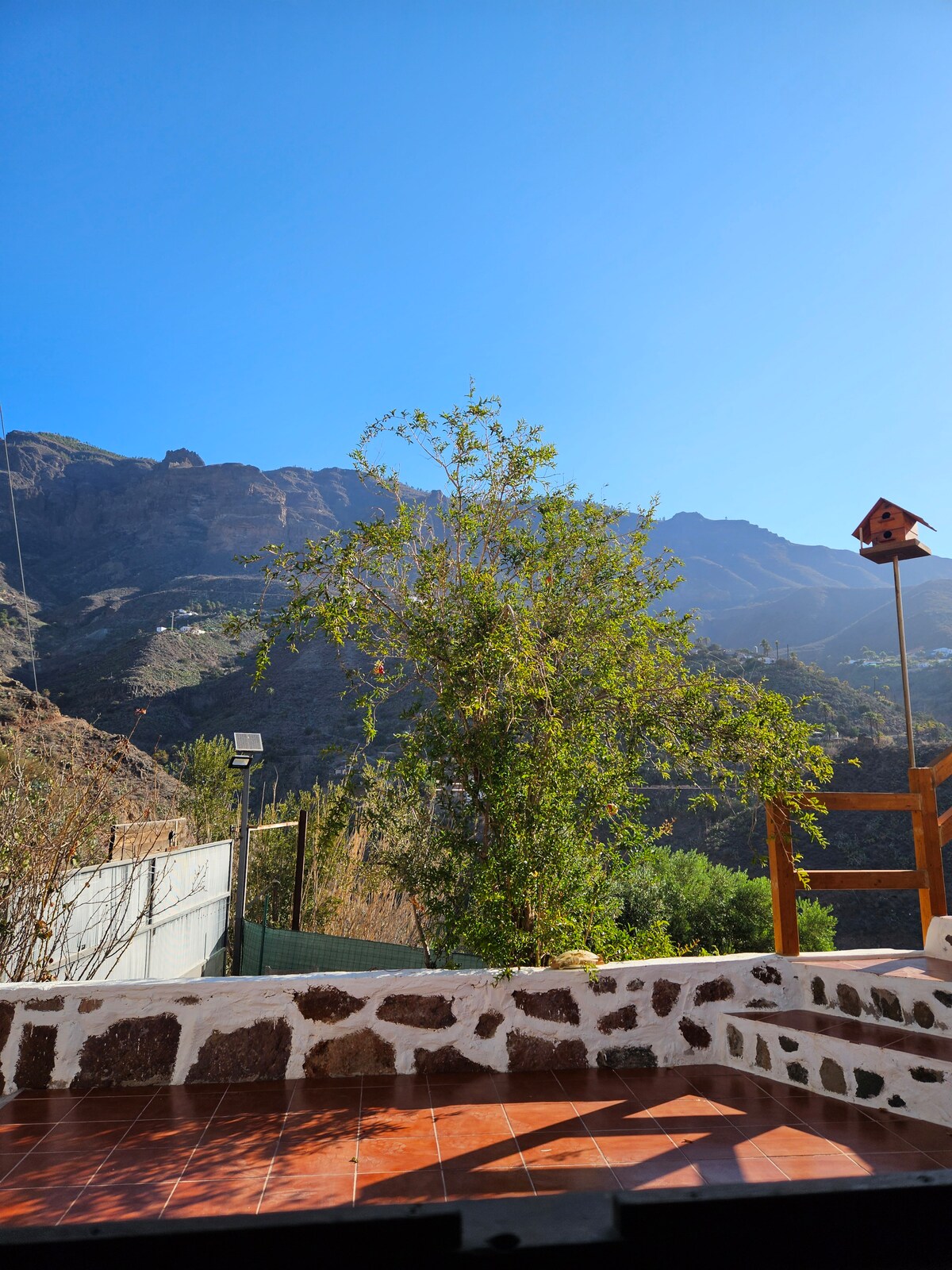 Located on the southern slope of the island, in the volcanic caldera of Tirajana, an idyllic place. The view opens 360° to the palm groves of the valley and the volcanic peaks. It has a heated and salt-treated swimming pool with a waterfall. It is on a property next to another vacation home for two people. Both houses are completely independent and have their own entrances and services, with parking and the pool being the only shared areas. Therefore, privacy is guaranteed.