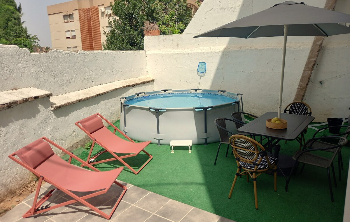 Disconnect from the routine in this accommodation with pool, garden and barbecue just 15 minutes from the center of Granada. A cozy place where you can breathe peace and tranquility. Two minutes walk from two bus lines that will take you to the center of Granada.
