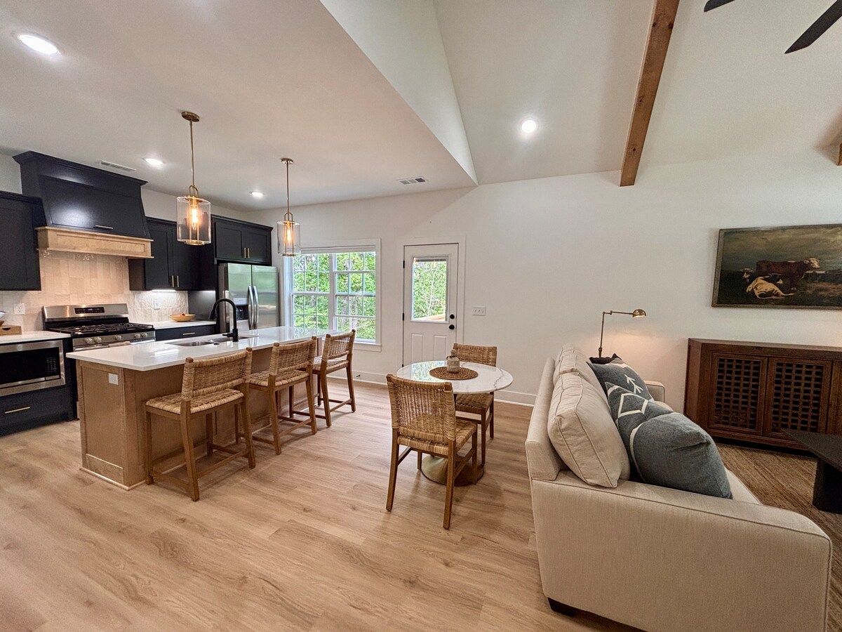 This fully stocked home welcomes you into the beautiful wooded views for ultimate peace and relaxation. There is a surprise waiting for you in every corner, from the modern yet rustic décor to the amazing deck which nestles beautifully into the trees just like a tree house. If you're feeling adventurous, a private yet steep trail will lead you to your own private dock where you can enjoy amazing views of a calm and quiet lake which you will almost always have to yourself.