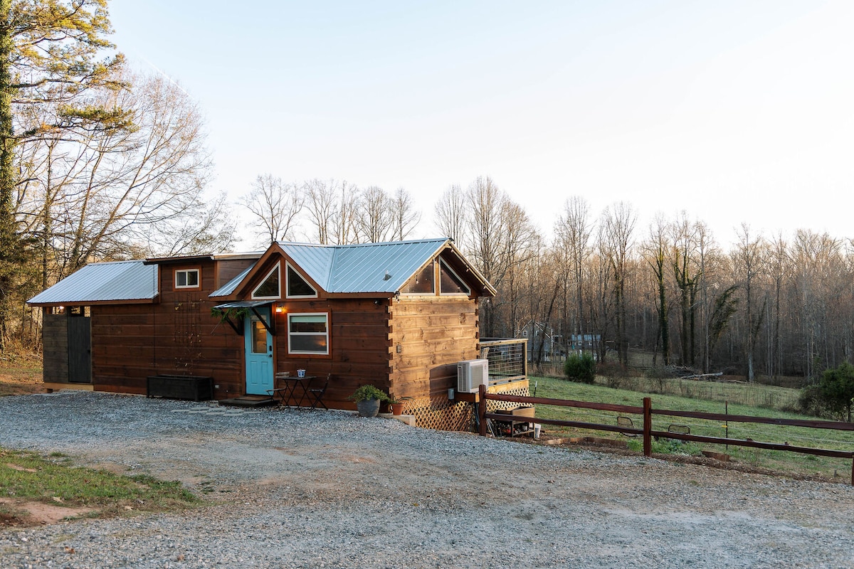 Cozy tiny home cabin in the Blue Ridge Foothills, near mountains for hiking or biking, Table Rock and Sliding Rock, small town shopping and eating; between Greenville, SC and Hendersonville, NC. Perfectly outfitted for a night or week. Dog lovers we have a fenced in dog park! Extra guests? There is a cleared space for your TENT beside the Cabin for $20. Message me to reserve it. Or also reserve my Airstream or Trolley. Here during the week? Check out our Wednesday evening Farmer's Market.