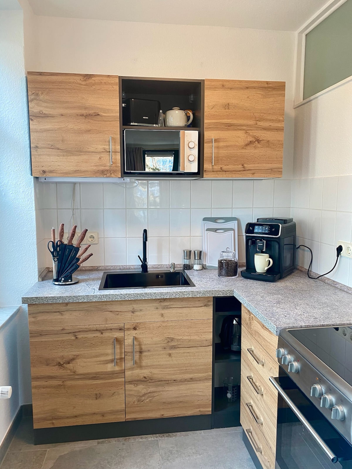 Apartment/Einraumwohnung mit separatem Hauseingang. Der helle Wohnbereich bietet eine stimmungsvolle Beleuchtung, 1 Doppelbett, Essecke, TV-Flachbildschirm mit kostenfreien WLAN, SAT, NETFLIX, Garten & Terrassenzugang. Die Küche- E-Herd, Backofen, Kühlschrank/Froste, Kaffemaschine, Toaster, Wasserkocher, Geschirr, Grundgewürze Im Flur befindet sich ein großer Kleiderschrank mit Bügeleisen, Bügelbrett und Schuhregal. Bad -Dusche,WC, Föhn, Handtücher, Toilettenpapier, Seife Shampoo, Duschbadr