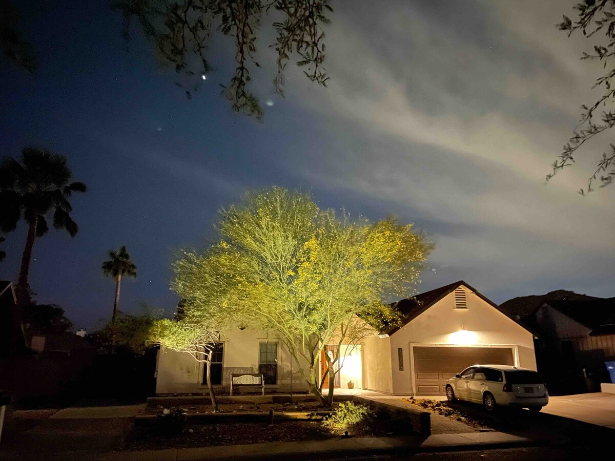Welcome to Southwest Mod, remodeled with touches of the West. Clean, comfortable, quaint neighborhood. AHWATUKEE LOCATION: 10 minutes to Sky Harbor Airport, 5-30 minutes to Tempe, Chandler, Scottsdale and Gilbert. 10-30 minutes to several spring training facilities. Casino and Golf courses nearby. Two blocks to South Mountain trailhead. Close to stores and restaurants! Resort style backyard with mountain views, eating and lounge area, fruit trees, propane grill and firepit. Pool is NOT heated.