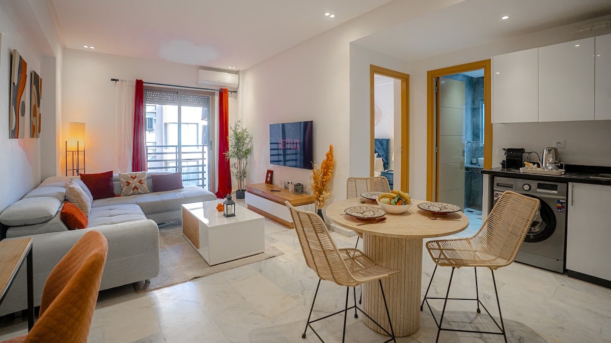 Modern apartment in Guéliz, Marrakech. Queen-size bed with cozy duvet, hangers, and ironing facilities. Italian bathroom with shower, shampoo, conditioner, and hairdryer. Comfortable living room, smart TV, fast 200Mb WiFi, Netflix & Prime. Fully equipped kitchen with coffee machine, free capsules, water, and soft drinks. Located on a quiet street for restful sleep. Private balcony to relax. Jardin Majorelle 20 min, Medina 30min walk, Carré Eden just steps away, restaurants, cafés, and nightlife,
