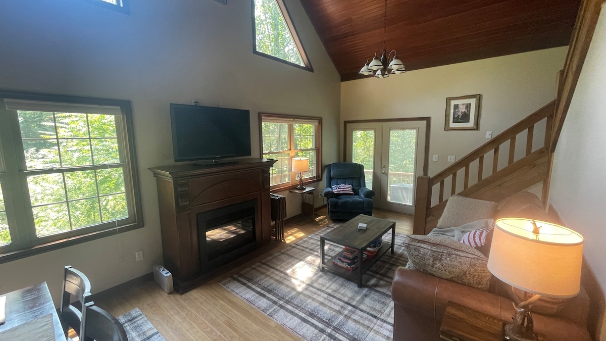 Come and visit our clean and cozy one bedroom cabin in the wooded hills of Guernsey county Ohio and relax on the spacious deck and listen to the sounds of nature, take a trail walk on the 19 acre property, or stay inside and ask Alexa to play your favorite tunes or stream a blockbuster movie on the 65" 4k UHD TV with 7.2.4 Dolby Atmos surround sound, the choice is yours.