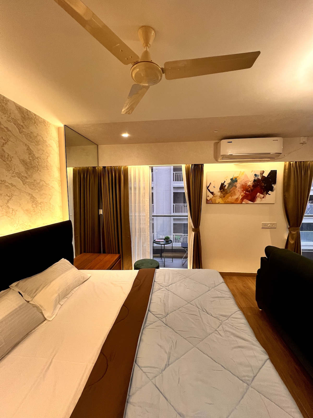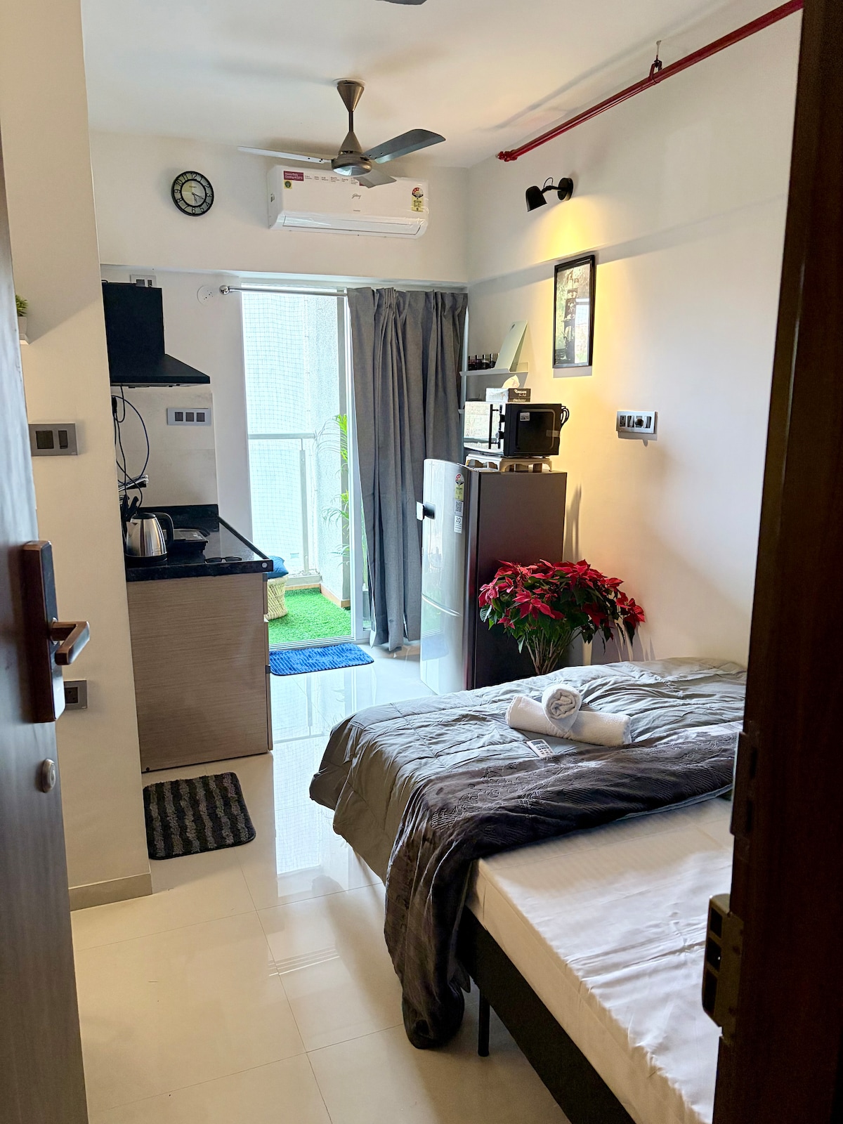 •Comfortable Living Space: Modern decor with a plush queen-size bed, a sofa, and a dining nook. •Fully Equipped Kitchen: Perfect for cooking meals or enjoying a morning coffee. •Amenities: High-speed Wi-Fi, a flat-screen TV, and AC •Prime Location: Close to public transport, shopping, and vibrant nightlife. Whether you’re exploring Pune’s attractions, savoring the local cuisine, or just unwinding, this studio has everything you need for a memorable stay. Book now for your perfect getaway!