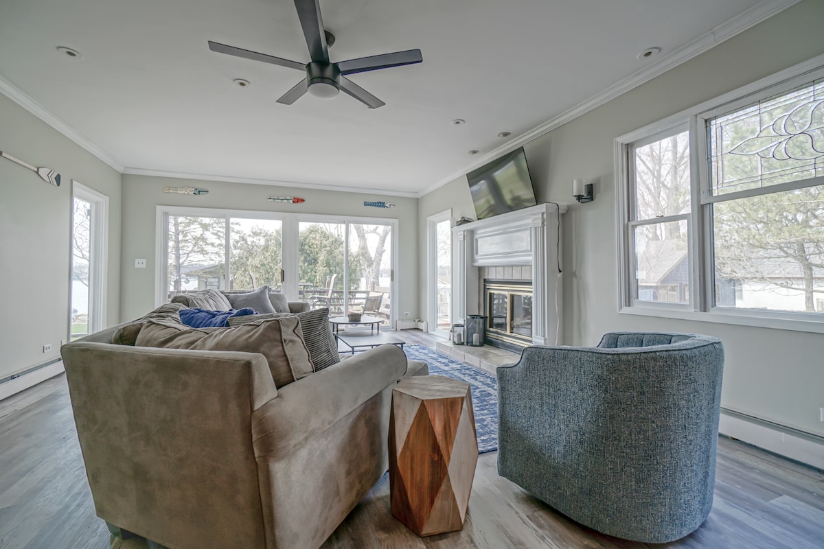 Lake Front with stone seawall, fire pit and jacuzzi. Two fireplaces, one wood burning and one gas. Floor to ceiling windows showcasing sunsets over serene Grayslake. Two paddler boats for you to paddle to Jones Island beach and playground. A five-minute walk to downtown Grayslake which boasts 9+ restaurants, an outdoor fireplace, two wooded parks with paved paths. A five-minute walk from the house to the Metra train taking you to downtown Chicago, a 1 hour train ride. Minimum 3 nights.