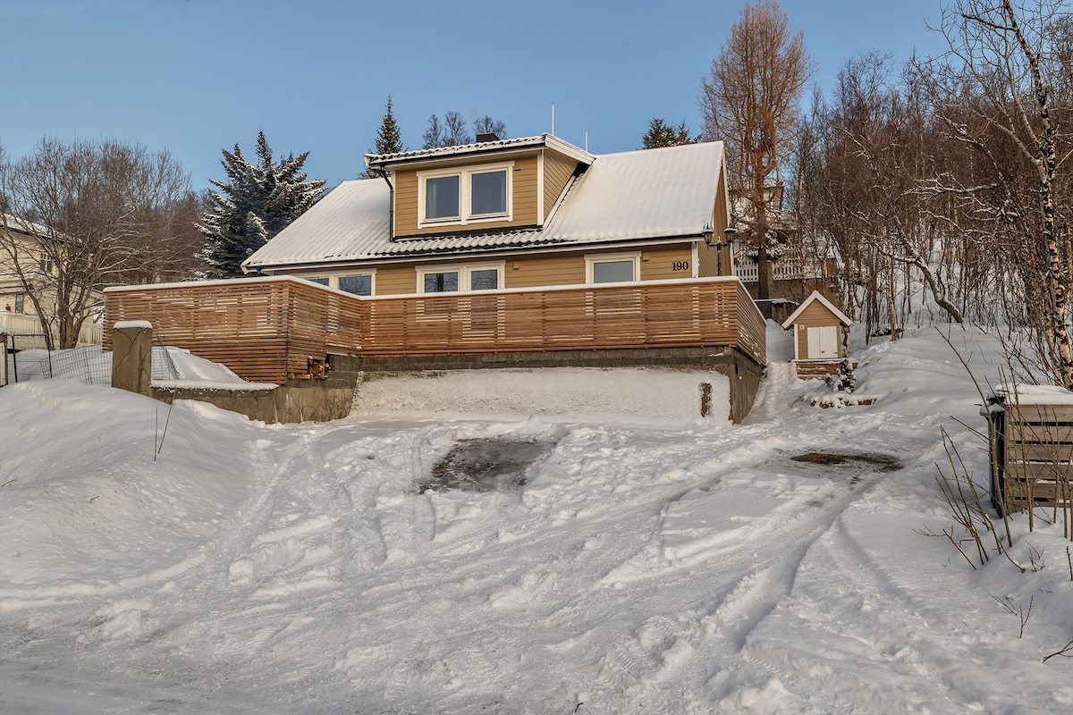 Here you live close to the city and close to nature, in a peaceful neighborhood with nice views of the sea and mountains. Access to private garden where you can enjoy the northern lights. 5-10 minutes walk to: nice nature areas with trails and ski slopes, indoor climbing hall, water park, grocery store, UiT and Botanical Garden. The city center is a short bus ride (7 min) away.