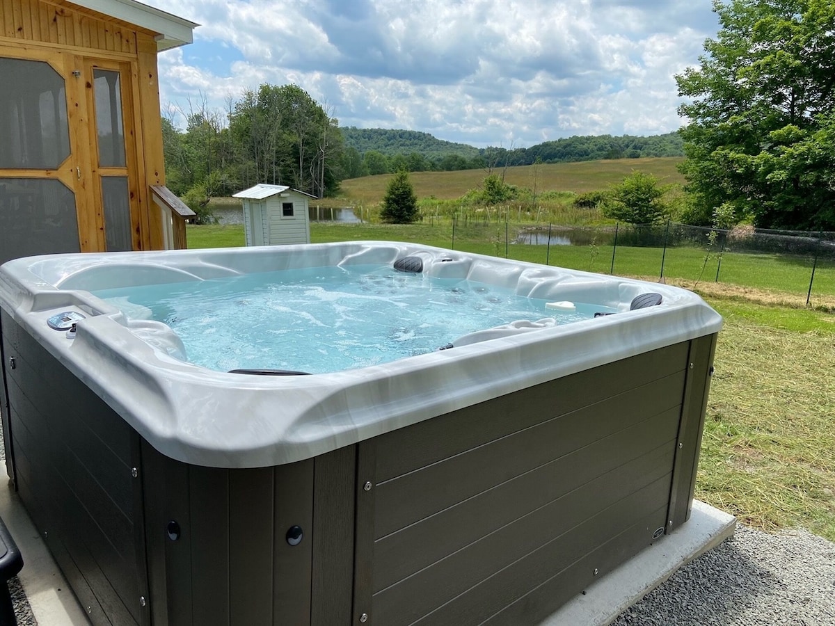 This off grid, alternative powered site is located towards the front of a large twelve acre estate, alongside a flowing brook. Elevated over a natural spring that flows year round, the Japanese inspired aesthetics of this private, tiny cabin sits perched atop a deck among the wooded trees overlooking the waterway the mineral spring feeds, but not before filling the in-ground, cedar lined, two person, bubbling hot tub heated with a wood burning stove. One of two glamping sites on the 12 acres.