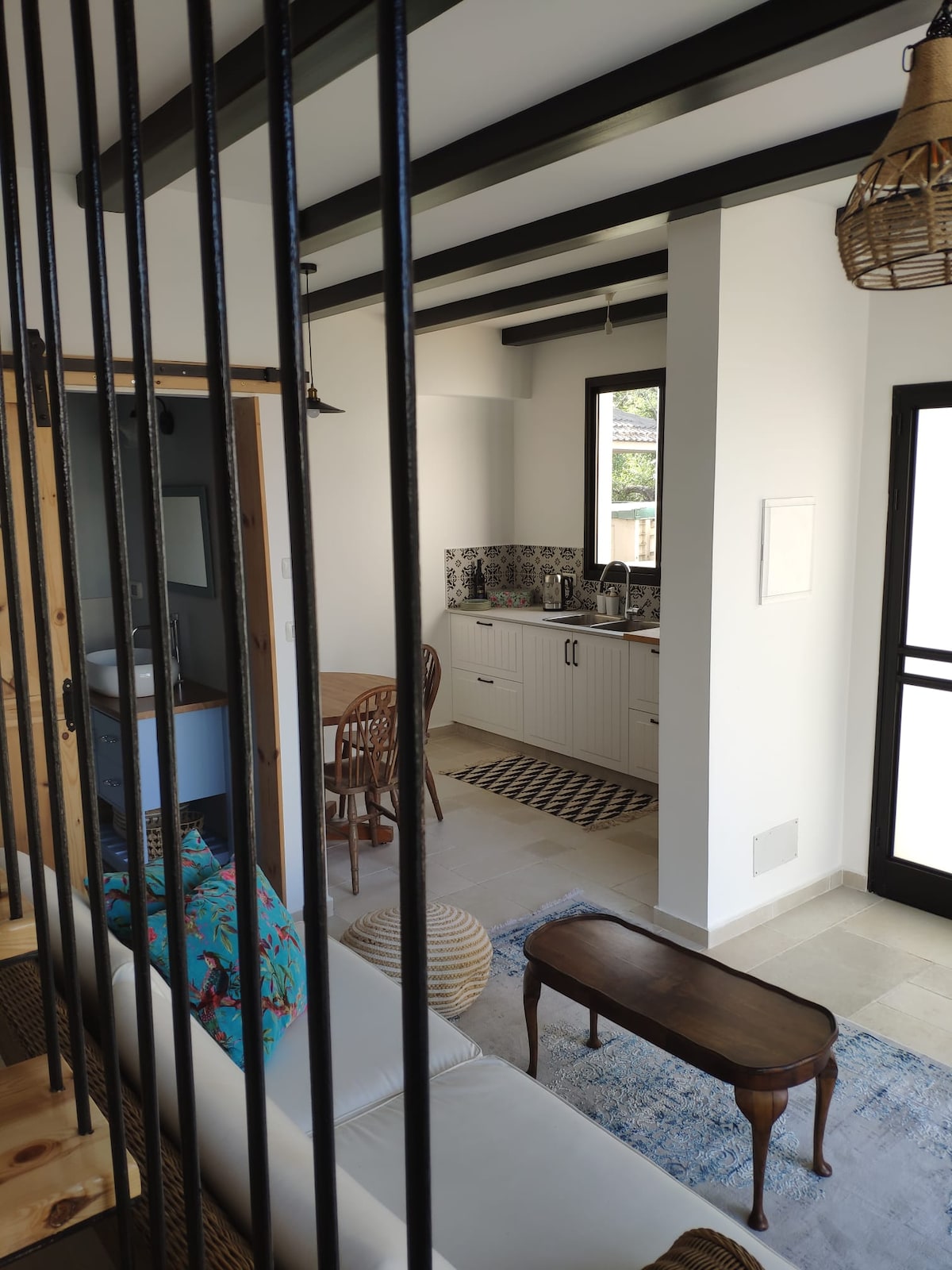 Stay in my luxurious 3-bedroom home in a quiet village in central Israel, featuring a 6-meter-high ceiling and a unique blend of upscale pop art and vintage decor. Enjoy sunrise views from the master bedroom and sunset from the panoramic terrace with a jacuzzi and outdoor shower. Includes a fully equipped kitchen, kids' room with bunk beds, safe room (mamad) with work and play areas, fast Wi-Fi, Netflix, washer, and dryer. Perfect for does who seeking comfort and style!
