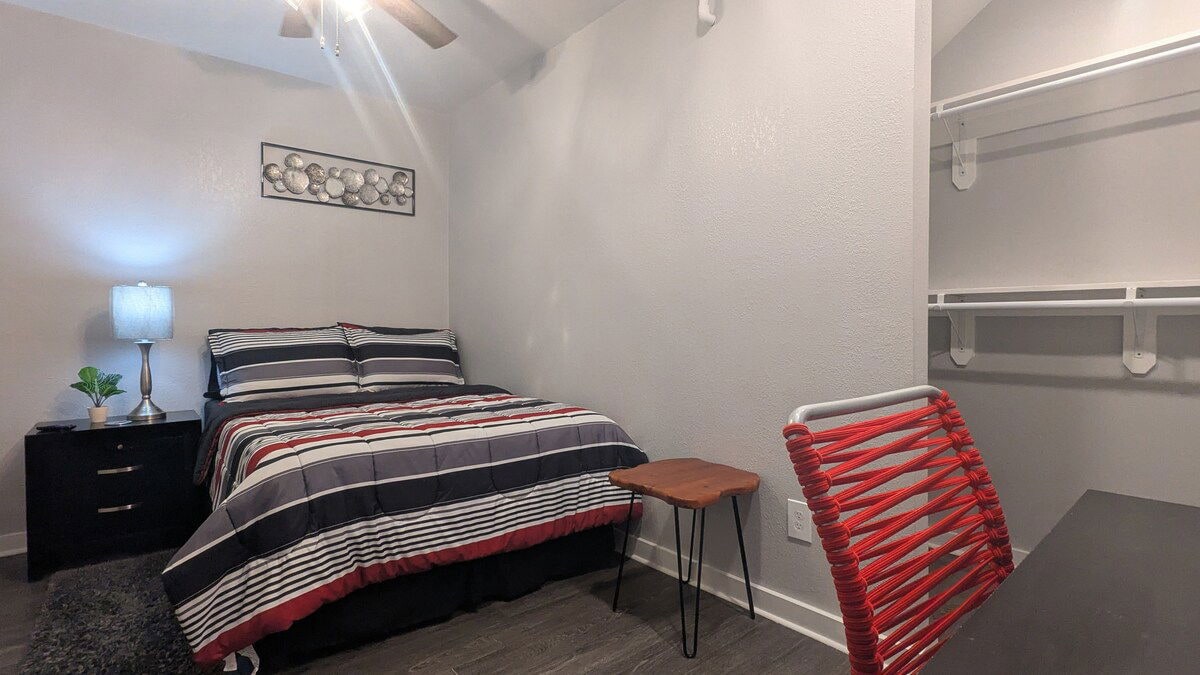 Welcome to my home!!! Come experience this 4-story container mansion in the heart of Houston!!! I guarantee you have never stayed in a homeshare like this before. Not just a gimmick, filled with two massive kitchens, private & common baths on each floor, lounge areas, and a jumbo 4th story patio with Views of Downtown Houston!!! This space: Ground floor Private Suite with double sinks, and a massive walk-in shower!!! Fully furnished traditional bedroom with a Queen Bed, walk-in closet, and TV.