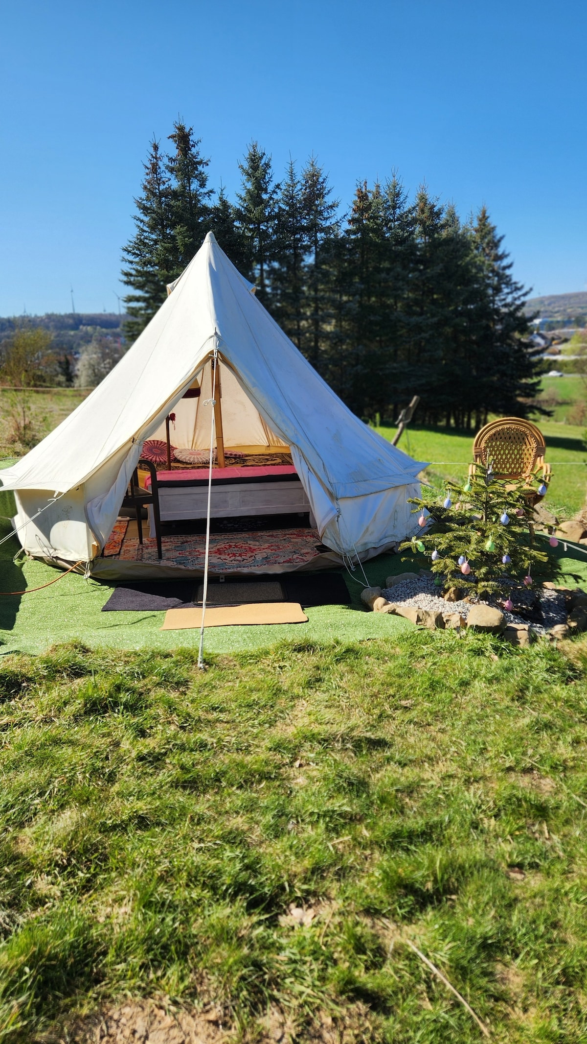 Close to the farm, but still secluded, in a comfortably furnished tent on the meadow behind the former tithe barn, two loungers invite you to make yourself comfortable, unwind, watch the donkeys and chickens in the adjacent enclosure and - when it is finally dark - watch the stars and listen to the nocturnal hustle and bustle in the native deciduous forest, protected behind the fence.