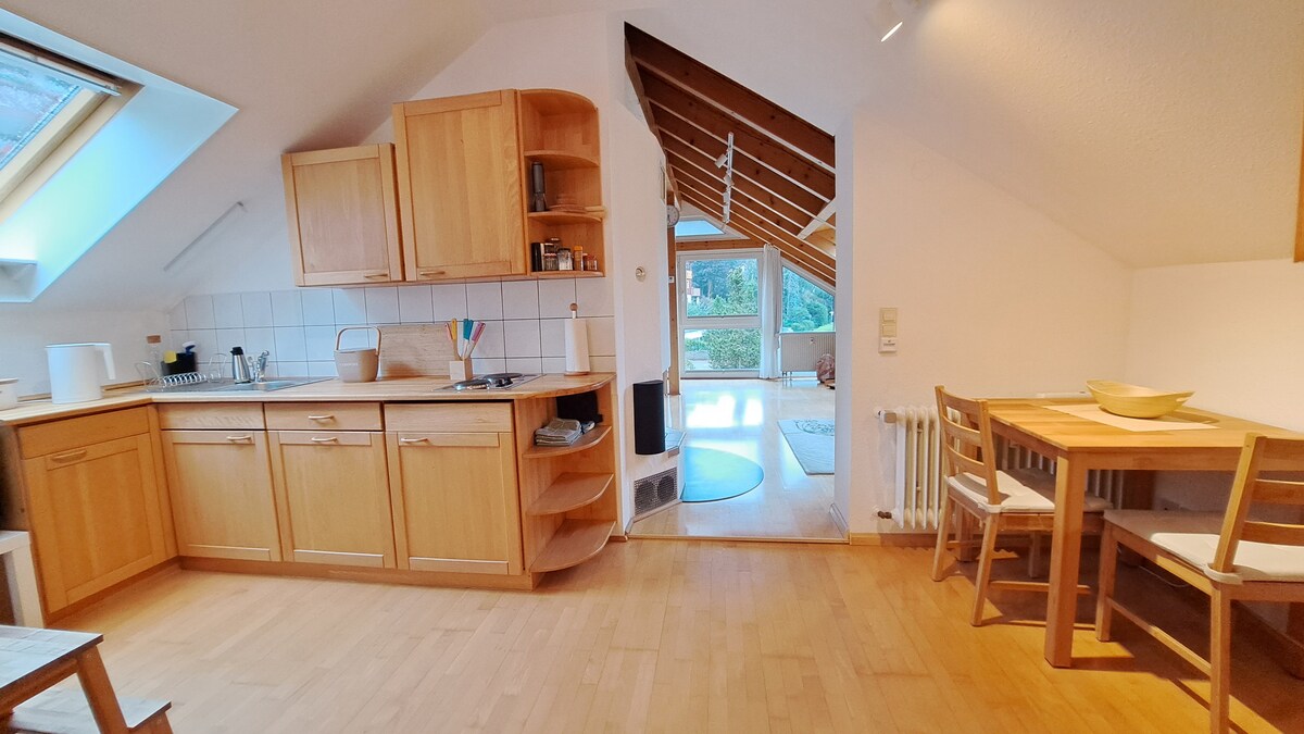 Small cloud with south balcony, well-kept, stylish and cool. 2-3 guests, 1 bedroom with double bed (180 x 200 cm), 1 high-quality sofa bed with mattress (140 x 200 cm) in the living-dining area, 1 bathroom The small, individually furnished apartment impresses with its cozy atmosphere. From the living-dining area, the view opens over the south balcony into the Black Forest.