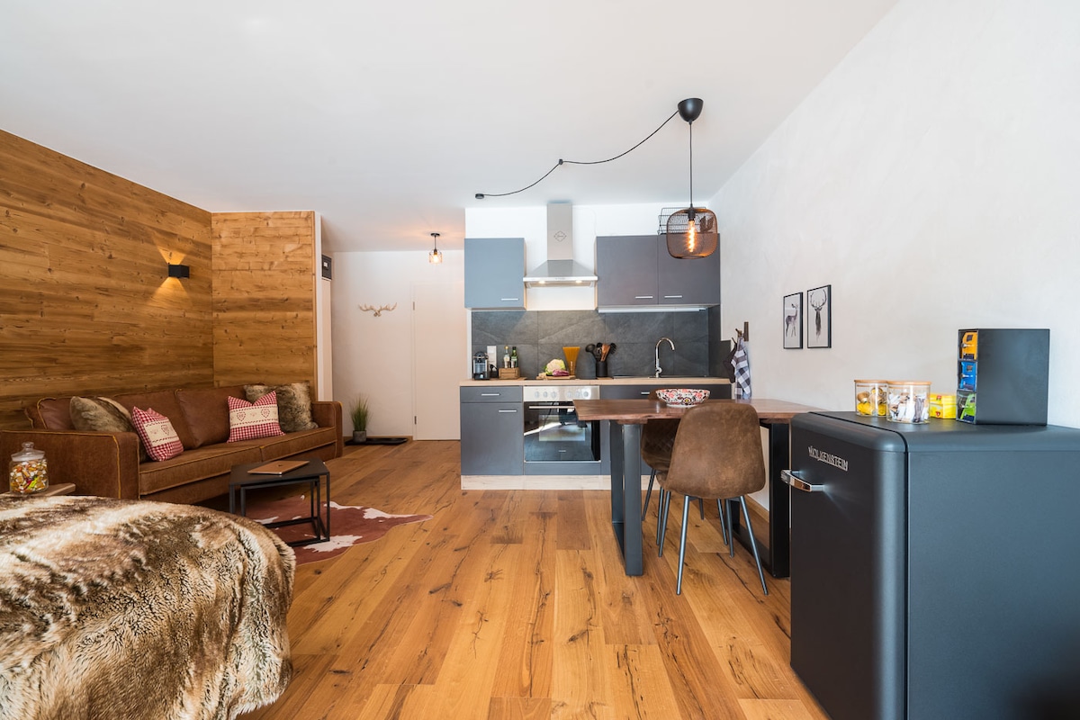 Enjoy a few beautiful days in our cozy studio apartment in chalet style with large sunny south-facing terrace. On the terrace is a lounge and a small dining table. Private parking space in the in-house underground garage. The village center can be reached in 10 minutes on foot. New kitchen with large ceramic hob and oven. Very comfortable and large bed 160x200 cm. The shower has a large rain shower head. We wish you a relaxing stay. Anna & Mike