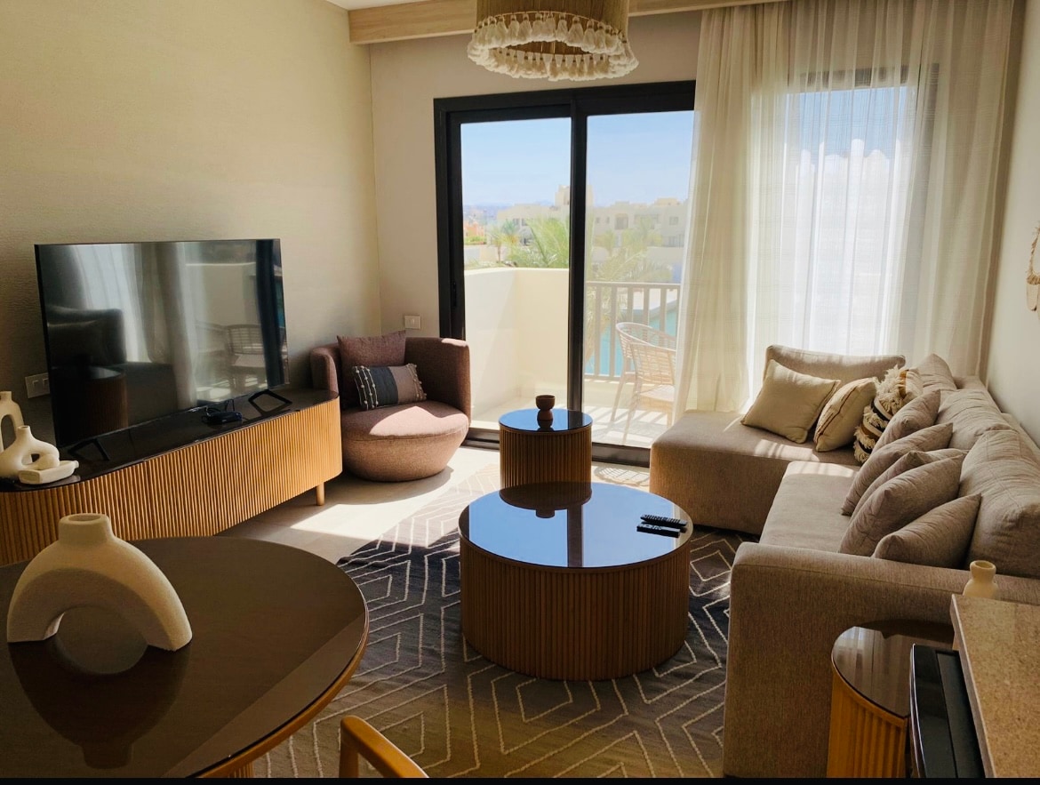 Escape to this peaceful and brand new 1 bedroom, 1 bathroom apartment in Kamaran, Orascom’s newest development in El Gouna. Just 10 minutes walk from Sliders and Waterside, enjoy luxury finishes and brand-new boho-chic furniture. Located on the ground floor, the apartment features a fully equipped private terrace and garden with direct access to the pool. The neighborhood also features common areas with picnic spots, play zones and tranquil green spaces—perfect for both relaxation and fun.