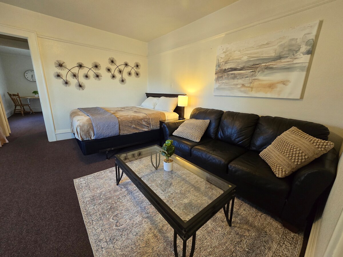 This cozy, yet surprisingly spacious apartment is on the second floor of a beautiful Victorian apartment building. You'll enjoy the 65" TV, comfy bed, couch and separate area for kitchen and dining! Second story patio access right outside the door. Coin Operated Laundry in building. Great monthly rates!