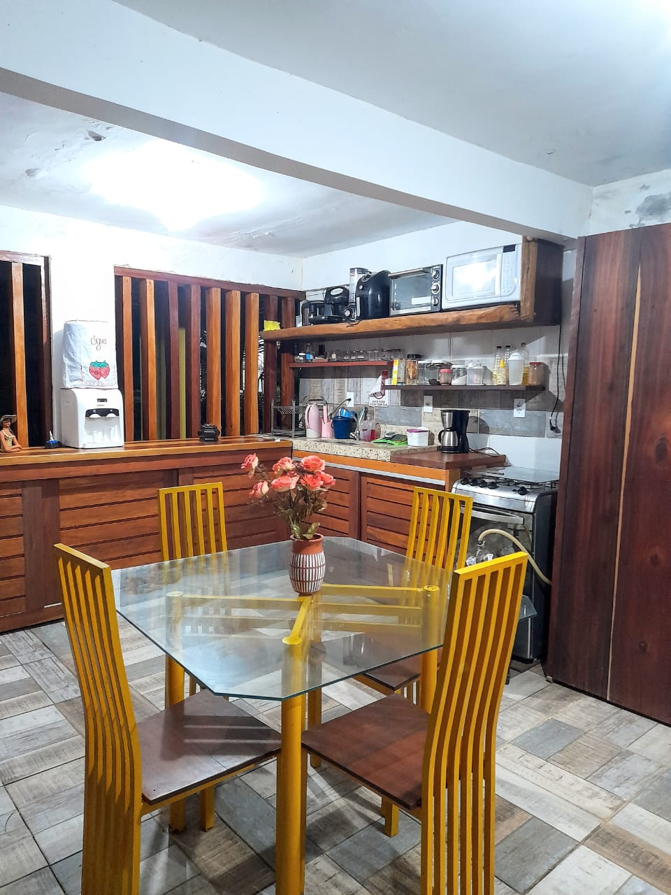 Enjoy with the family in this cozy home! It has 4 bedrooms, one suite, 3 air-conditioned bedrooms and the smallest bedroom, with a double bed, has a ceiling fan and is well ventilated. Being on the first floor, the whole house is much more ventilated. The balcony has a sink, barbecue and a 3 m table. Independent and private entrance and garage for 2 cars. We have a water treatment station, 3 kayaks with vests, a hat and a beach chair. We provide tips about the location!