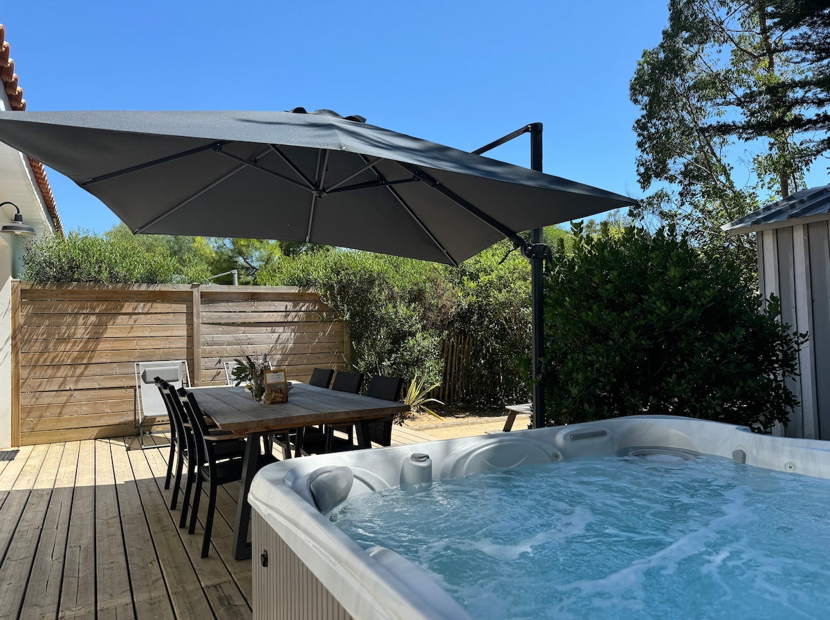 Terraced house facing the forest 300 m from the beach, 100 m from the first shops (in season) and 800 m from the town center. It consists of: Equipped closed kitchen. Bathroom 2 sinks and bathtub. Separate toilet. Bedroom with bed 140 Bedroom with sofa BZ and bed 90 + cot. Large living room with TV. Small courtyard at the back, Garden furniture and sunbathing. Public parking on the street. Possibility to work TV, equipped with orange fibre.