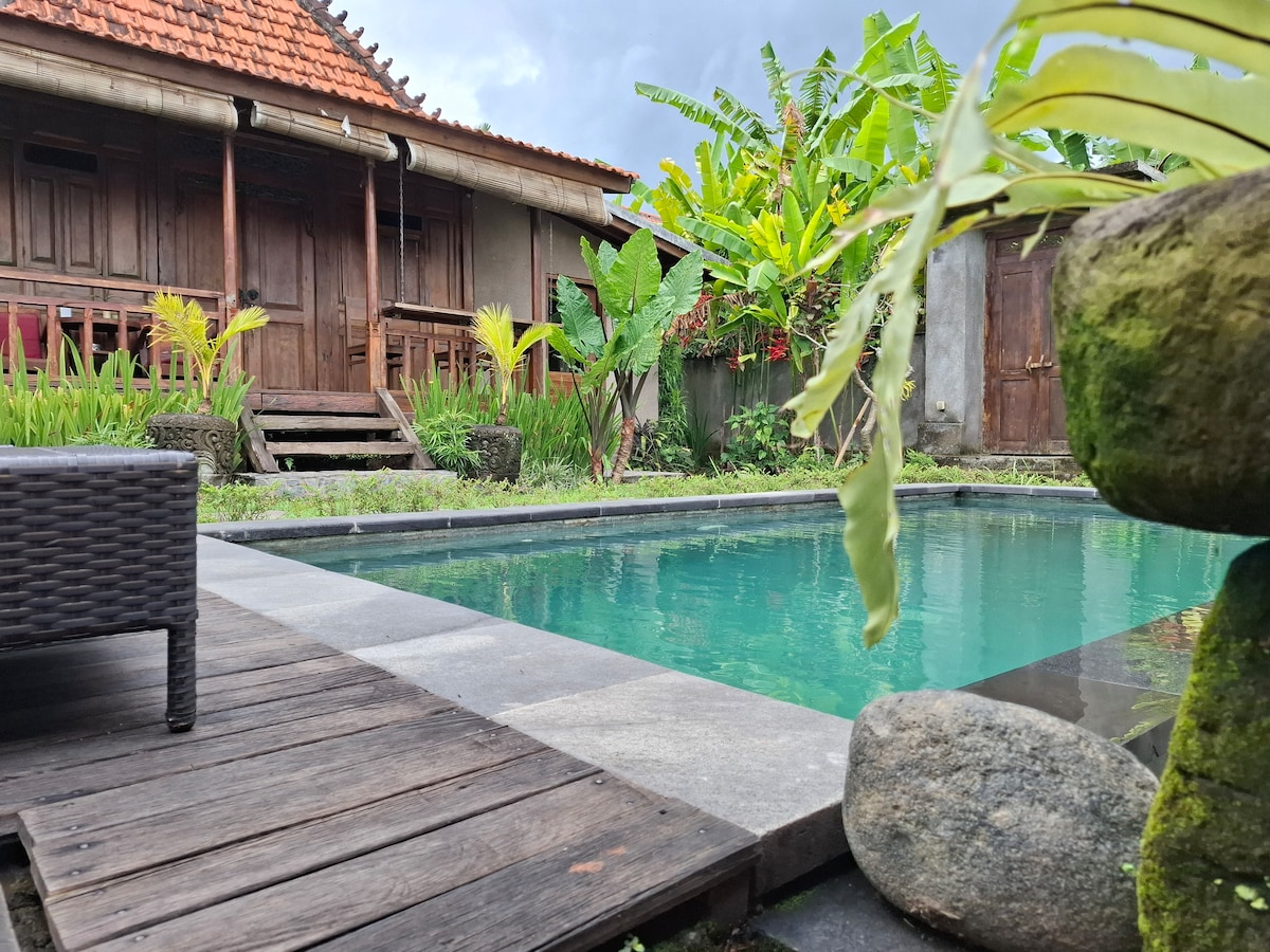A gorgeous century-old antique bungalow, original wooden house brought over from remote a village in Java, decorated with beautiful carvings in recycled teak wood. The balcony is facing the rice fields, with its own private outdoor pool and garden. In the heart of Penestanan village, a short motorbike drive to Blanco musium,champuan bridge walk,ubud place,ubud center,ubud market,mongkey forest,with ploating breakfast on request ,it was my plesure to serve and recomend you, enjoy your holliday.