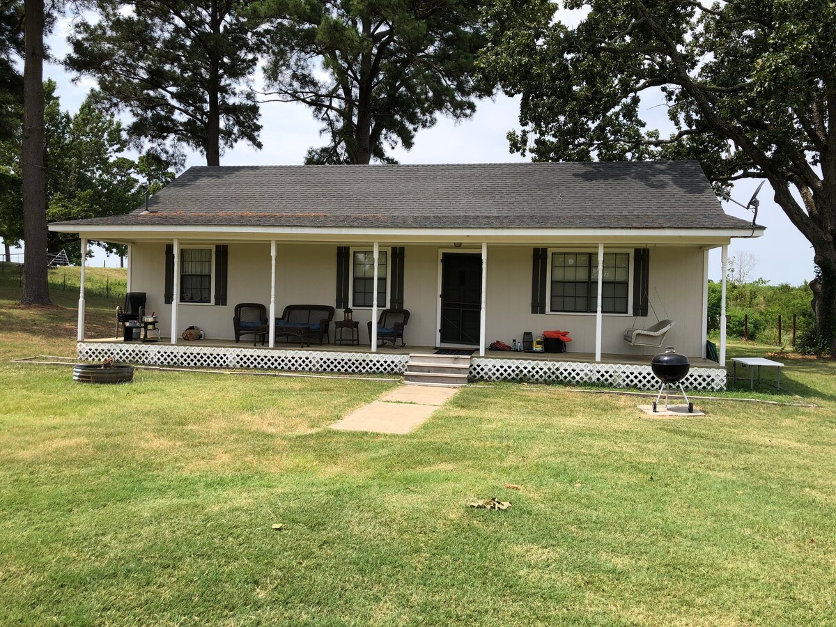 East Texas private Bass lake. Cabin is 40 yards from lake but not directly on the water. 2 bedroom, 1 bath. Our cabin is clean, simple, quaint, and fully furnished. The AC/heat is split units with ceiling fans in each room. Come sit on the front porch, relax on the swing, or use the charcoal grill and fire pit. The cabin can be rented for 1 to 4 people. Your stay includes free boat rental, trolling motor and battery. 2 hrs from DFW and Shreveport
