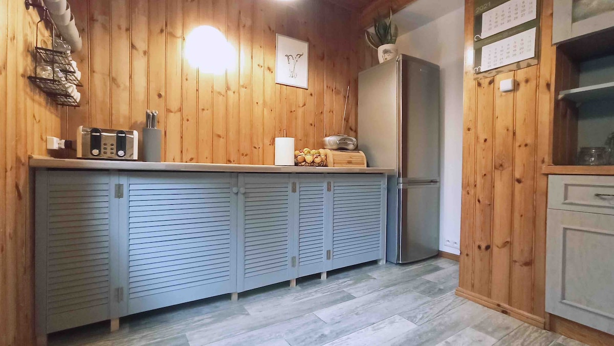 I invite you to our cottage, let relaxation in the jacuzzi and sauna and walks in the surrounding forests and meadows allow you to forget about everything for a while.... The 1300 sqm plot and 80 sqm house (for max. 8 people) are available for guests. The cottage has a bathroom, kitchen, living room with fireplace, two rooms upstairs, parking, fire pit and barbecue, trampoline, Jacuzzi, sauna. The river is 200 meters away. In the autumn and winter season, the cottage is heated by a fireplace and additional stoves. There may be temperature differences.