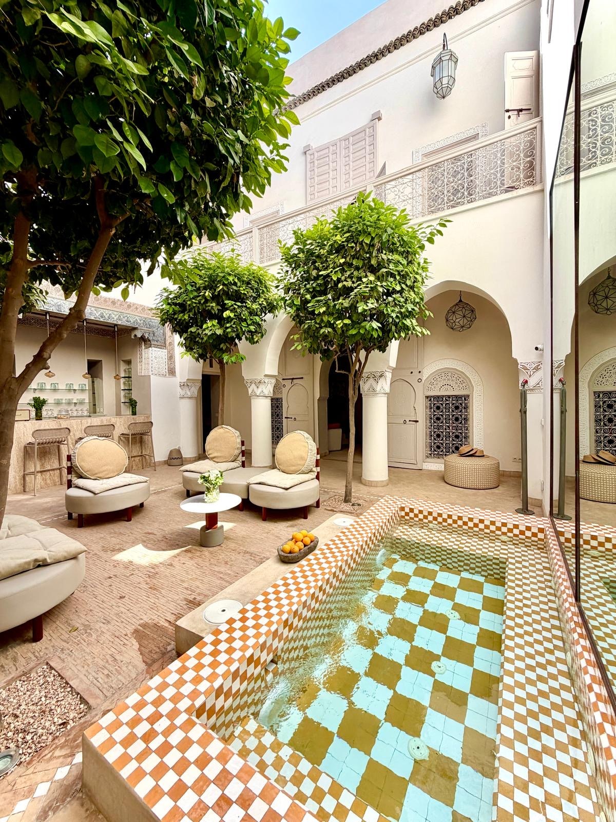 Dive into the history of this unique and memorable place. Come and relax in our private Riad SAFYA, renovated in a traditional Moroccan style with a modern touch. I literally fell in love with this beautiful riad during my pregnancy, which is why it bears the name of my beloved daughter. The central patio, with this sublime Zellige wall mural with floral motifs and its swimming pool, will be the perfect place to relax.