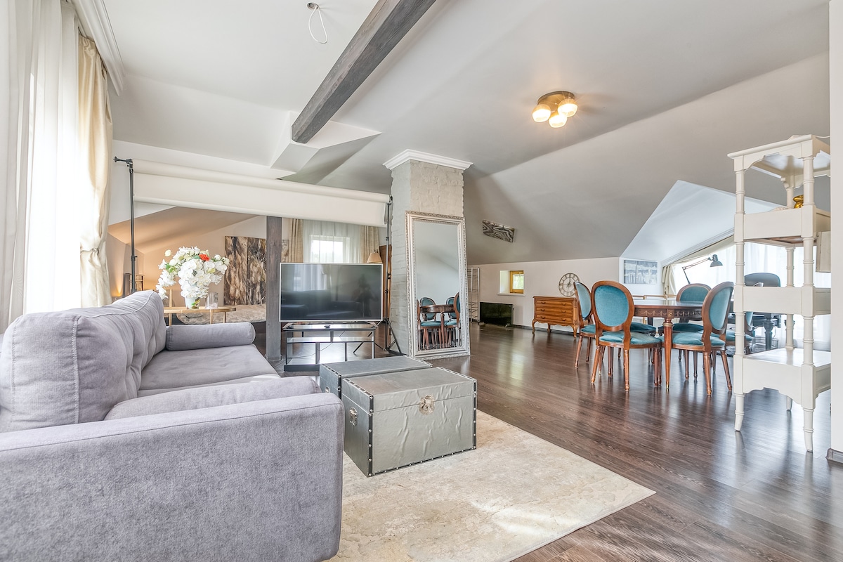 The best of Riga is literally at your feet from this very spacious centrally-located designer loft. It is a renovated multi level, high ceiling 90m2 apartment on the top floor of a more than a century old architectural heritage building.