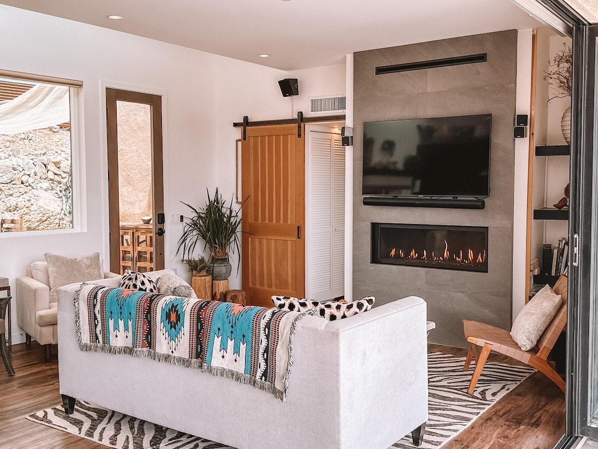 Welcome to the spacious, sun-filled oasis with 360-views of mountain+desert vistas - >2000 sqft of living space - 10 mins from West entrance of JT national Park -5 minutes to JT Village shops+cafes. -Brand new construction -Custom firepit under the stars -Starlink 🛰 200mbps -Fully stocked chief's Kitchen -Coffee Bar and Cocktail supplies -Dedicated Yoga+Meditation room -Oversized Spa- heated year around -Tesla EV level 2 charger -Record Player We invite you to unplug and reset @CasaSerranoJTree