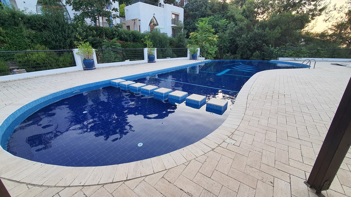 A decent, quiet, villa-like boutique site located just behind Alsancak Walking Park, where you can descend to the pool from the living room terrace with a 6-step staircase It is only 300 meters away from the famous Escape Beach. It is in a nice location, in the middle of Merit Royal and Cristal Cove Hotels in Alsancak and Kaya Palazzo Hotel in Karaoğlanoğlu in the other direction. Even if you don't rent a car, the street with minibuses is 250 meters away. Suitable for up to 5 people in total A house you'll be a regular at