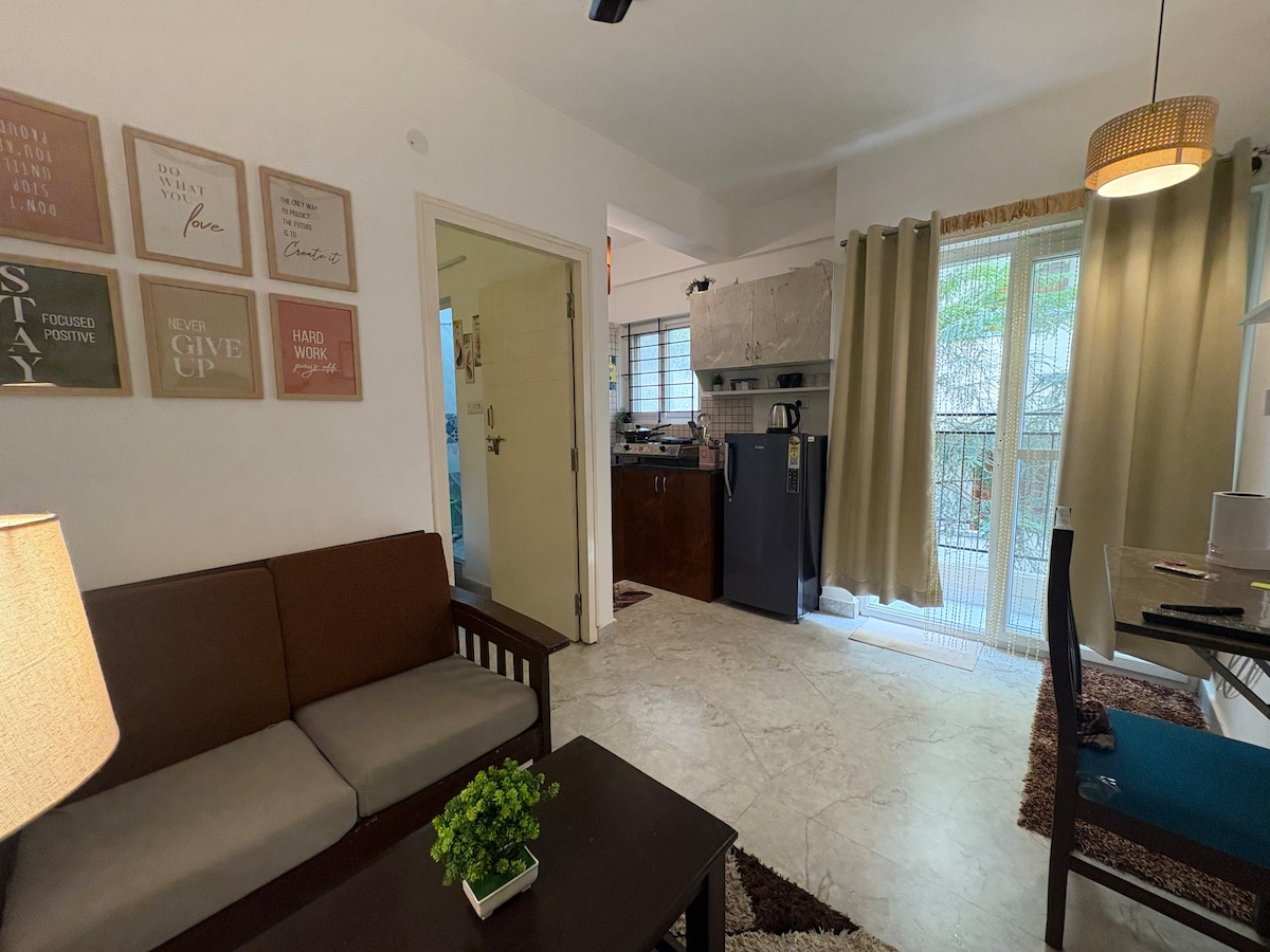 Spacious 600 square feet Designer 1BHK Suite with Private Balcony | High-Speed fibre optic Wi-Fi & Smart TV with streaming platforms, Work/Dining Desk, 24/7 power backup for uninterrupted work and comfort |Luxe King Bed & Orthopaedic Mattress ,wooden wardrobes for storage | fully equipped Kitchenette | Couch Bed in living room , Max.Occupancy 4 | Elevator access, professional housekeeping and access to paid laundry on site for long stays| Located in Central Bangalore | LGBTQIA++ Affirmative