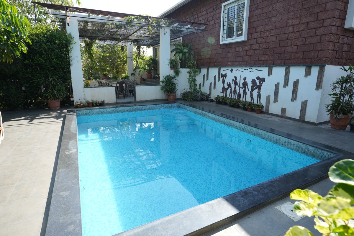 Our 3 BHK villa with Infinity swimming pool having area 2 acre is situated on the edge of the historic Jyotiba temple of Kolhapur. We offer 3 BHK bungalow for 8-15 people & big spaces for dining, TV, karaoke system, relaxing. The bathrooms and kitchen have modern amenities (Kitchen is only use by caretaker.) Amenities - Infinity swimming pool, AC, hot water, TV, karaoke system, Wifi, garden, play area for kids Nearby places - Panhala Fort , Jyotiba Temple, Mahalakshmi Temple, Rankala Lake