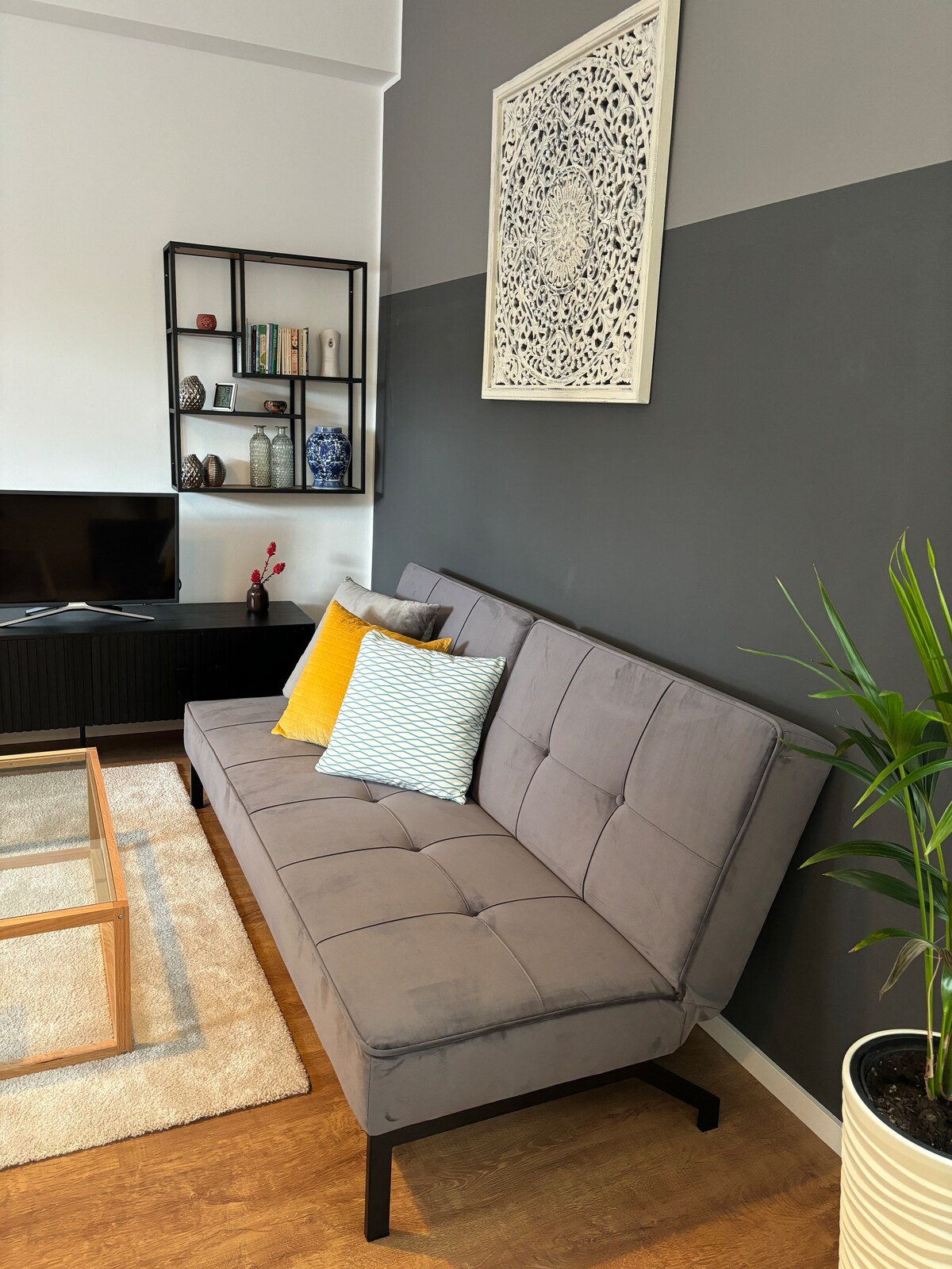 In this cozy, newly renovated apartment in Frechen you can perfectly relax after a city trip to Cologne. The tram is within easy walking distance in just 5 minutes and you are in the middle of Cologne in 20 minutes. In the immediate vicinity of the apartment you will find supermarkets, cafes and a weekly market. The apartment offers you a bedroom, a living room with a sofa bed (up to 3 guests), a balcony, a fully equipped kitchen + bathroom, a smart TV and fast Wi-Fi (100 Mbps).