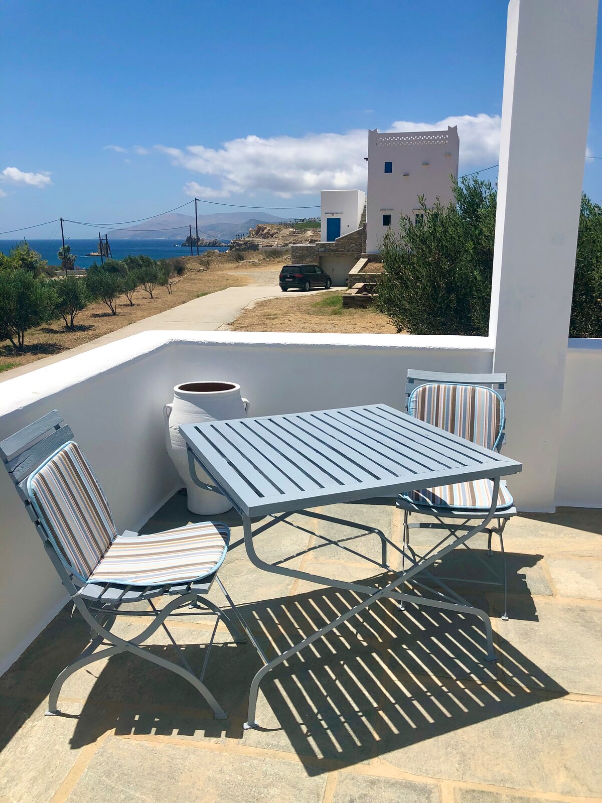 Panoramic port view apartment is fully equipped, ideally located a small complex with a private road, on a hill over the beach of Ios port. Focus on the breathtaking panoramic view of the Port, Chora and Santorini. The endless blue of the Aegean sea unfolds at your feet. Just a 3 minutes drive from Ios port and 8 min drive to Chora. We recommend you to rent a car, motorbike or atv, in order to explore all the beautiful beaches and Ios scenery. Feel free to enjoy your privacy with a great view.