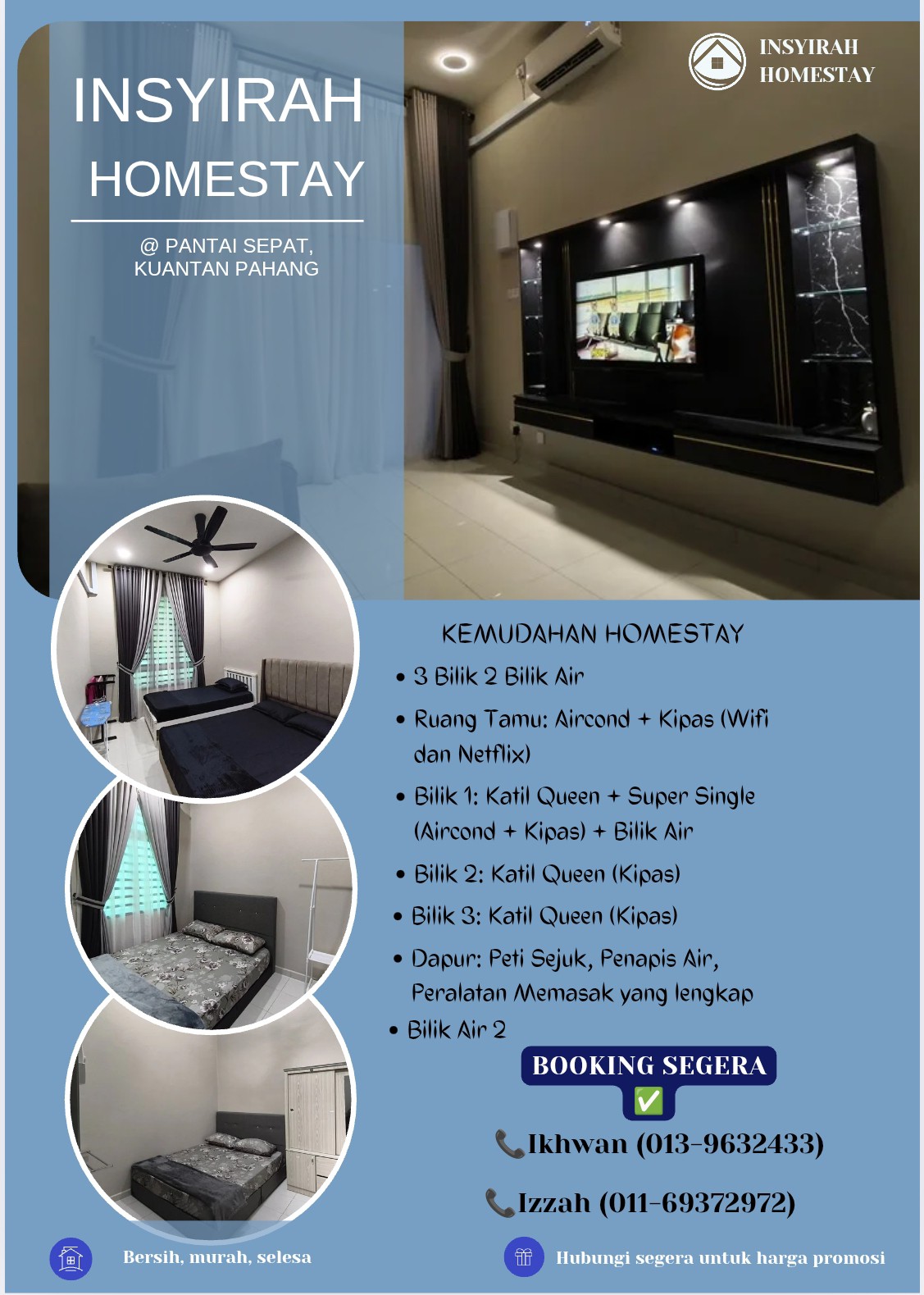 Welcome to our cozy 3-bedroom stay in Cenderawasih, Kuantan! Perfect for families or small groups, our home offers comfort, convenience, and a peaceful vibe. Located just minutes from Kuantan town, eateries, and attractions. Enjoy self check-in, free parking, and all basic amenities for a relaxing stay. Ideal for both short and long getaways! HTAA - 7 minutes East Coast Mall - 12 minutes Teluk Cempedak - 14 minutes UIA - 13 minutes