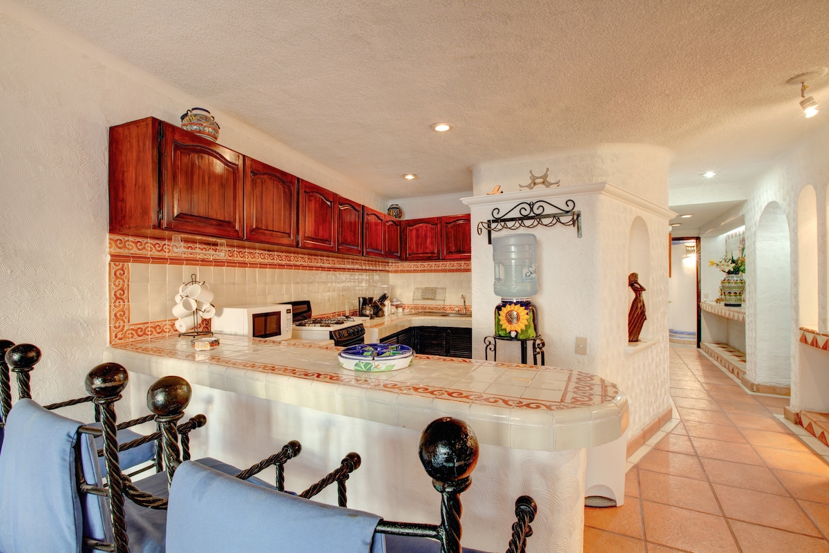 Welcome to Casa Celestial! Hear the waves crash and see the crystal blue ocean from every main room in this traditionally-decorated condo. Watch the fantastic sunsets every night from the private patio. Our building is the only one in Puerto Vallarta where guests can snorkel onsite! The condo has a 1500 square foot, bright & open, villa-like 2-floor layout. Located in the beautiful Conchas Chinas area - the “Beverly Hills” of Puerto Vallarta - it’s close to everything, yet quiet and peaceful.