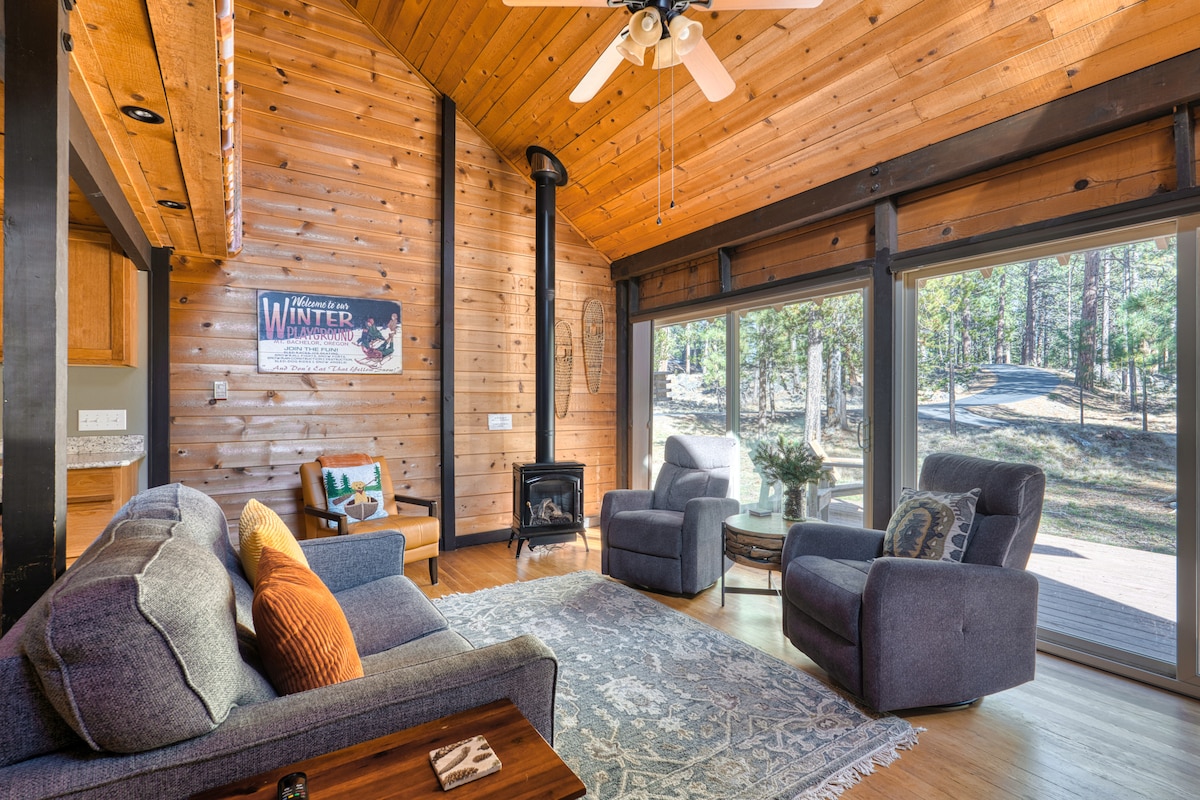 Prime OHV Basecamp Cabin – Ride directly into Deschutes National Forest & miles of trails. Trailer-friendly loop driveway, garage, air compressor & wash hose. Handcrafted wood & stone A-frame with woodstove (free firewood), Traeger BBQ & propane firepit. Comfortably sleeps 6 (max 8). Additional guest fee after 6. Up to 2 dogs welcome with $75 per-stay pet fee (automatically added when included on reservation).