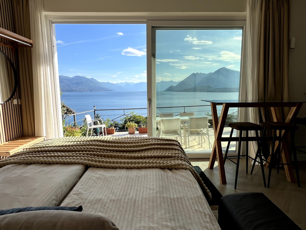 Relax in beautiful and scenic Italy. Our humble studio apartment offers expansive views of Lago Maggiore and mountains. The area is quiet and peaceful. Private lake access is a 10 minute walk. If you'd like to walk to Stresa, we recommend first driving 3 minutes and starting up the hill (23 min total / avoids steps). Please note: You will have to walk through our upstairs living room (8m distance total) while we wait for approvals to build external stairs.